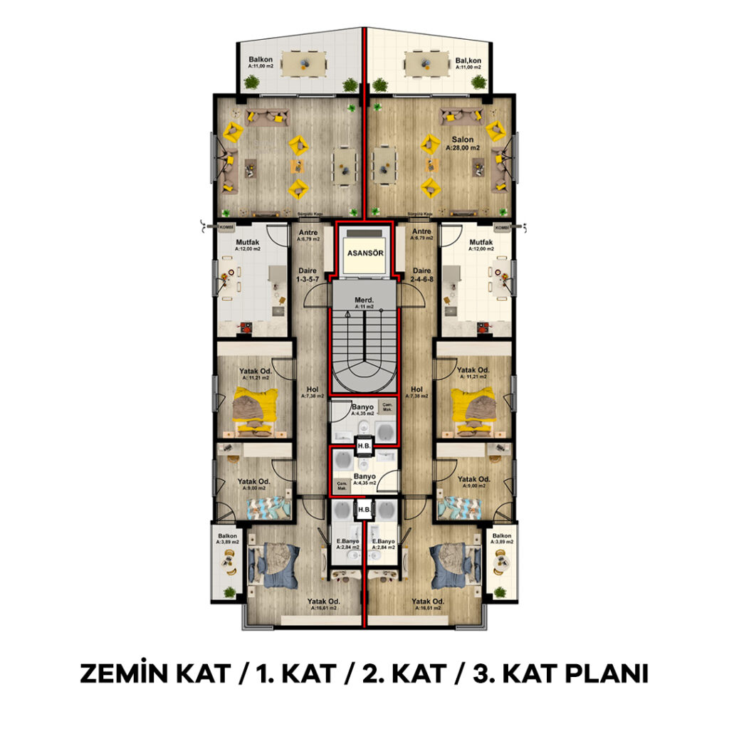 Geniş cam cepheleriyle gün ışığını içeriye davet eden daireler, 3+1 yaşam alanı planıyla konforlu bir ev hayatı vaat ediyor. Açık mutfaklı geniş salonlar, modern banyolar, ebeveyn banyosu detayları, ferah balkonlar ve her kat için özenle planlanmış ortak alanlar projeye ayrıcalık katıyor.